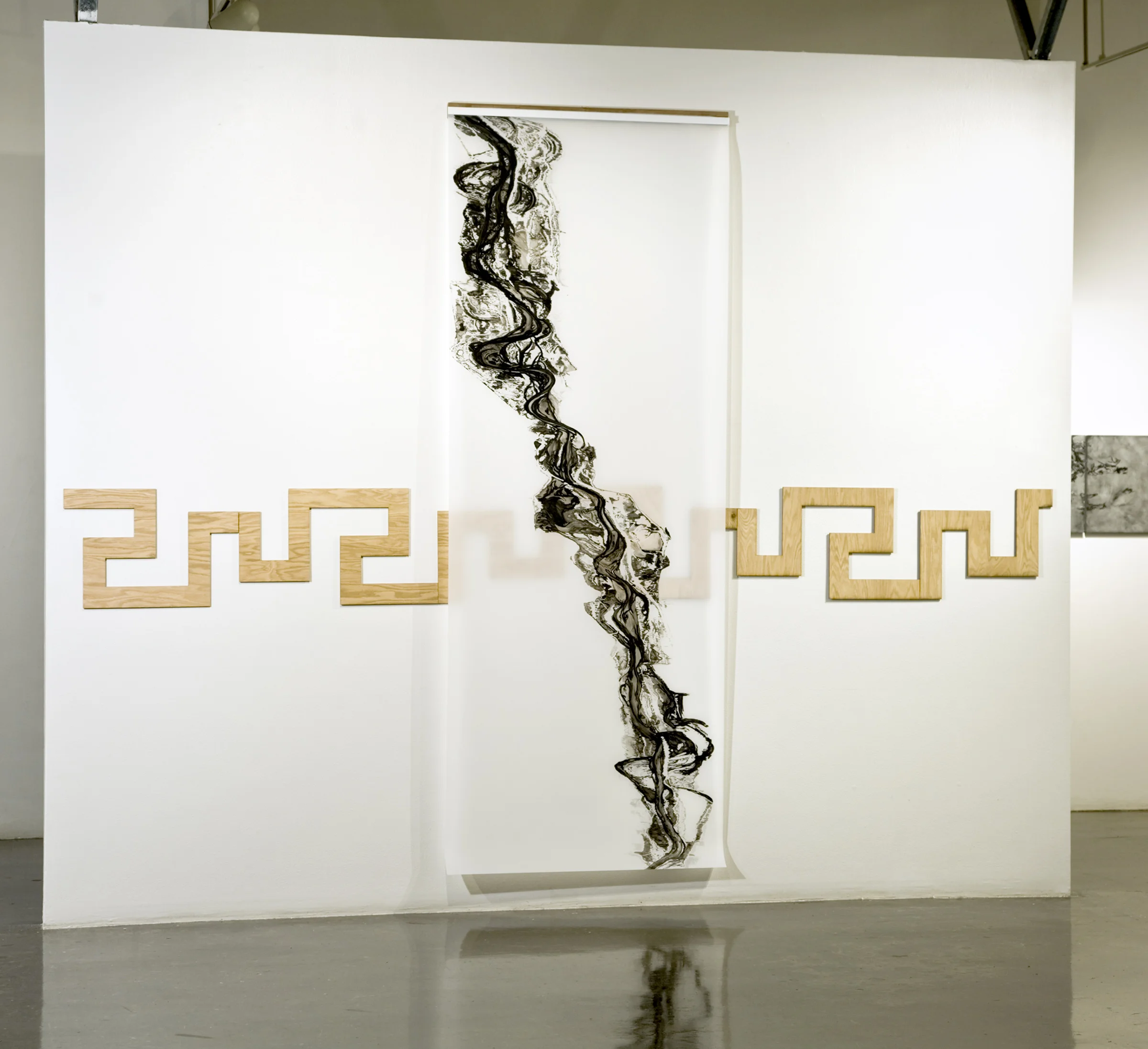 MEANDER INSTALLATION, Ink on duralux, 110"x40", pattern in birch, 16" x 144", Southwest School of Art, San Antonio, 2016.